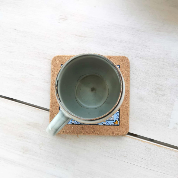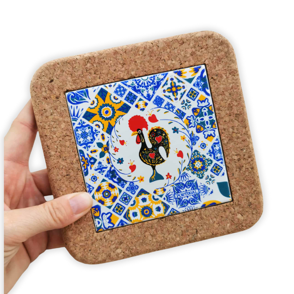 ✔ Gruba, kwadratowa, dekoracyjna korkowa podstawka pod gorący kubek z płytką ceramiczną azulejo z typowym portugalskim motywem koguta z Barcelos i napisem Portugal to gratka dla miłośników tego kraju.