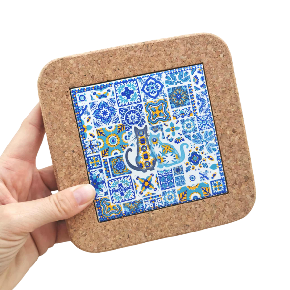✔ Gruba, kwadratowa, dekoracyjna korkowa podstawka pod gorący kubek z płytką ceramiczną azulejo z typowym portugalskim motywem kolorowych mozaik oraz kotami i napisem Portugal to gratka dla miłośników tego kraju.