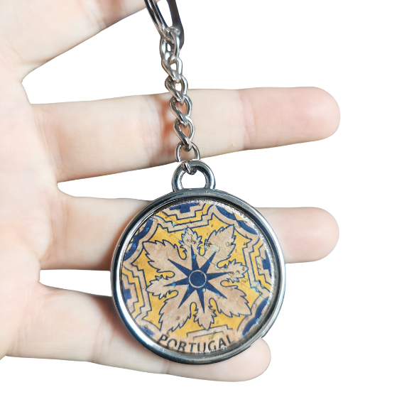 ✔ Metalowy breloczek, zawieszka do kluczy pokryty korkiem z tradycyjnym kafelkim azulejo i napisem Portugal.