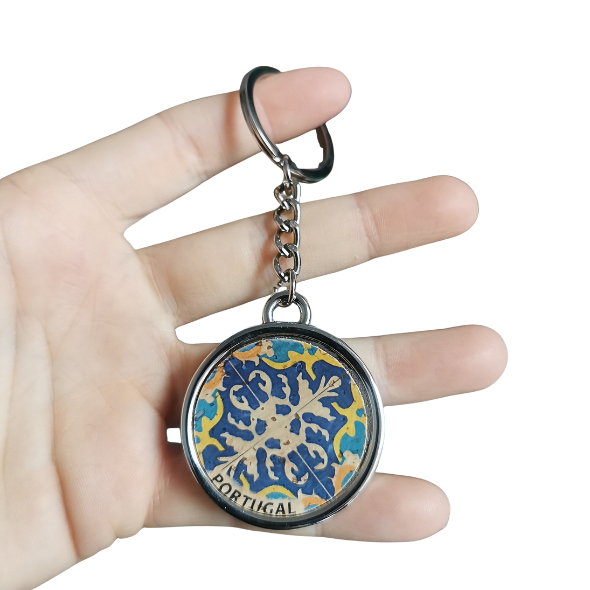 ✔ Metalowy breloczek, zawieszka do kluczy pokryty korkiem z tradycyjnym kafelkim azulejo i napisem Portugal.
