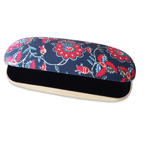 ✔ Twarde, metalowe etui do okularów pokryte miękką mikrofibrą z tradycyjnym, portugalskim wzorem Chita de Alcobaça w kolorze granatowym i czerwonym.