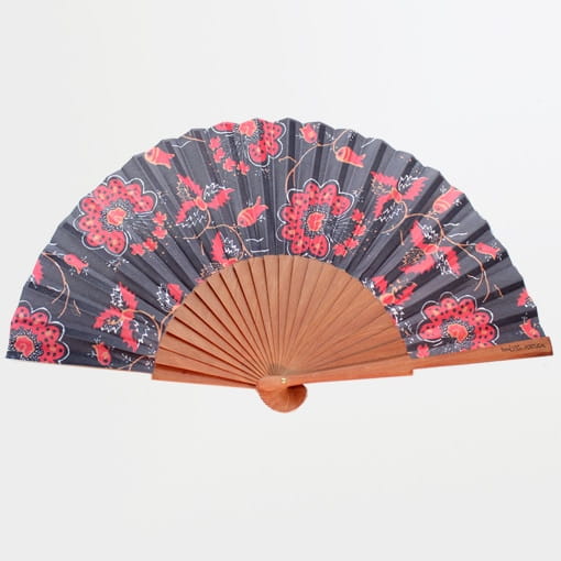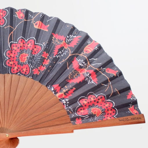 Jedwabny wachlarz z motywem Chita de Alcobaça to prezent z ponad 500-letnią historią. Głęboki granat z czerwonymi kwiatami - ta kolorystyka natychmiast przyciąga wzrok i opowiada historię spotkania dwóch kultur. Pochodzi z kolekcji Terra Lusa - marki sprzedawanej od 2004 roku w muzeach i na lotniskach Portugalii.