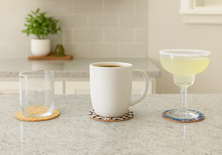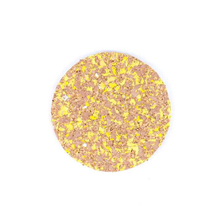 Spód każdej podkładki wykonany z naturalnego korka - nie rysuje blatu, nie ślizga się i amortyzuje uderzenia. Wierzch z EVA z recyklingu w kolorowym wzorze terrazzo – odporny na wodę i łatwy do wytarcia wilgotną ściereczką. Podkładki pasują pod kubki, szklanki, kieliszki i butelki.