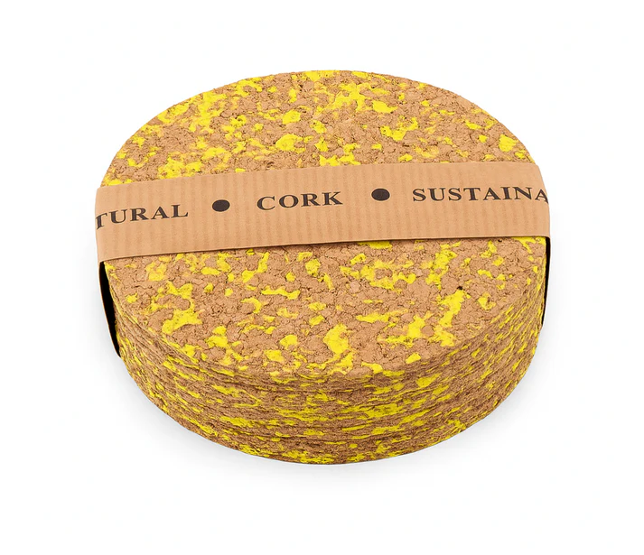 Podkładki pod kubek z naturalnego korka i EVA z recyklingu - lekkie, wodoodporne i antypoślizgowe. Wzór terrazzo w trzech wariantach kolorystycznych: żółty, niebieski oraz czarno-biały. Zestaw 10 okrągłych podkładek średnicy 10 cm, zapakowanych w ekologiczną taśmę z papieru kraft - gotowy do podarowania lub użycia od razu.