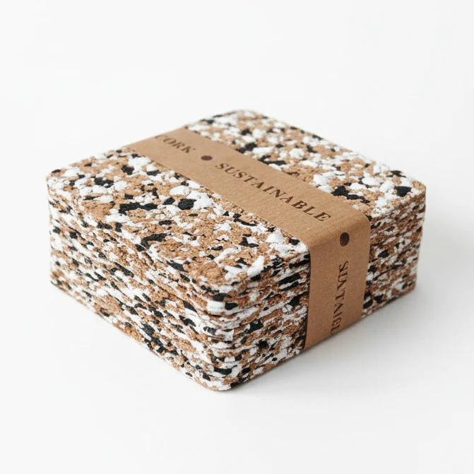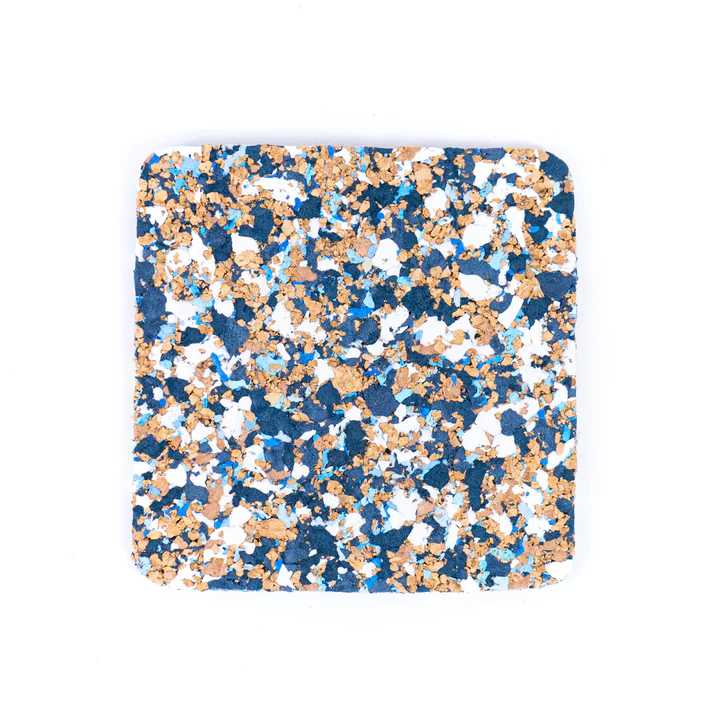 Kwadratowe podkładki pod kubek wykonane w 100% z recyklingowanego korka i gumy EVA - bez użycia nowych surowców. Wzór terrazzo w kolorowym wydaniu dodaje charakteru każdemu blatowi. Zestaw 10 sztuk w rozmiarze 10 × 10 cm, gotowy do użycia i zapakowany w eko opakowanie.