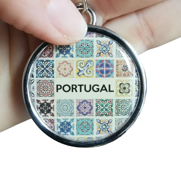 ✔ Metalowy breloczek, zawieszka do kluczy z tradycyjnym wzorem kolorowych mozaik i napisem Portugal.