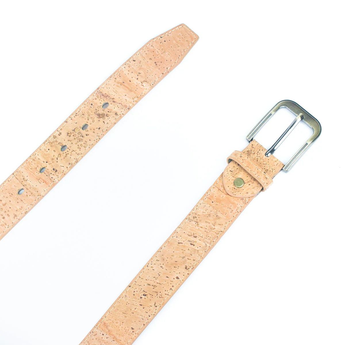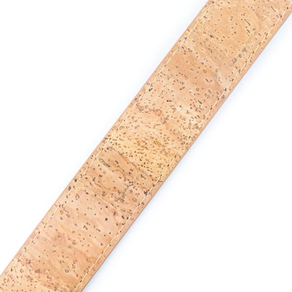Męski pasek do spodni z korka w naturalnym odcieniu - ciepły beż z widoczną teksturą dębu korkowego. Szerokość 3,3 cm pasuje do szlufek większości jeansów i spodni casualowych. Długość 120 cm z możliwością skrócenia. Klamra z czarnego metalu - prosta i solidna.