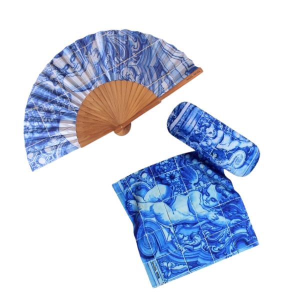 Jedwabny wachlarz Angel i dopasowane etui z ściereczką z kolekcji Terra Lusa to kompletny zestaw kolekcjonerski który łączy piękno i praktyczność. Oba produkty zdobione tym samym motywem niebiesko-białego azulejo z aniołem - inspirowanego słynną kaplicą Capela das Almas w Porto. Razem tworzą spójny, elegancki prezent który jest czymś więcej niż zwykłą pamiątką.