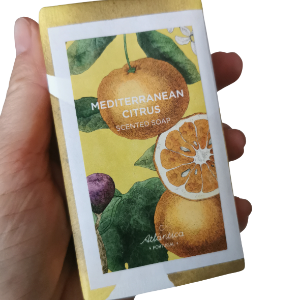 Mydło 150 g – trwałe, delikatnie pieniące się, o intensywnym, orzeźwiającym zapachu cytrusów. Każda sztuka jest ręcznie pakowana, co podkreśla jej unikatowy charakter.
